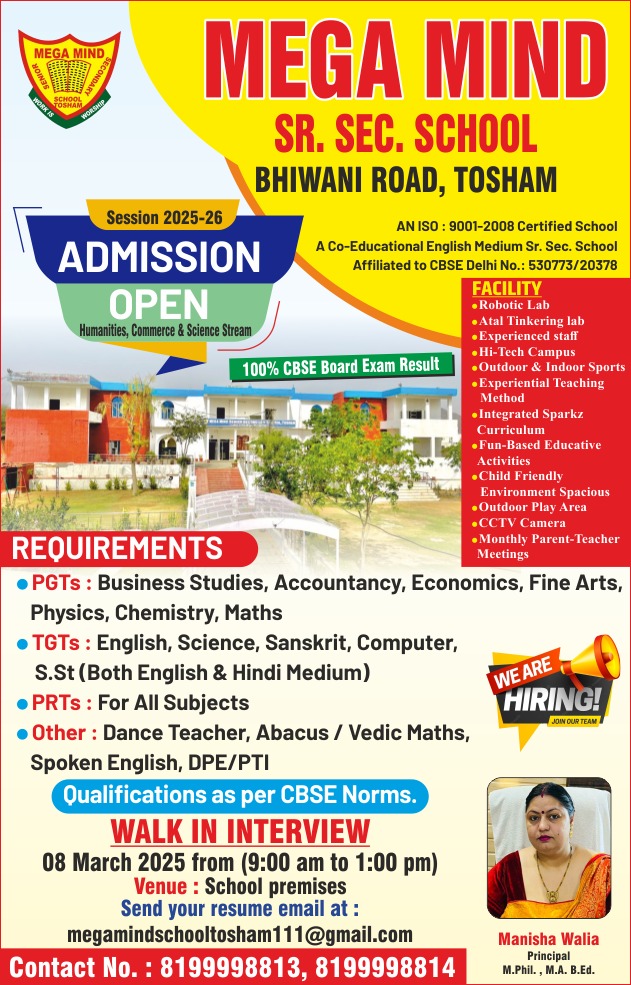 Mega Mind Senior Secondary School, located in the heart of Tosham, is dedicated to nurturing young minds and fostering academic excellence. Established with the vision of creating well-rounded individuals, our school provides a holistic education that emphasizes both academic rigor and character building. With state-of-the-art facilities and a team of highly qualified educators, we are committed to empowering students to achieve their fullest potential.